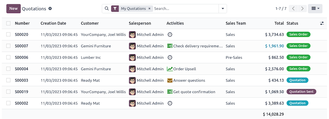 Agenda llamadas y reuniones o programa el envío de correos y cotizaciones. Odoo se encarga de planificar la siguiente actividad según la configuración que hayas elegido para tus ventas.